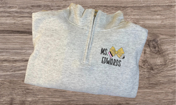 Stay cozy and show off your teaching pride with our Personalized Teacher Pencil Bow Quater Zip Pullover. This customized pullover features a unique pencil bow design and can be personalized with your name. Perfect for keeping you warm and stylish in the classroom or on-the-go.