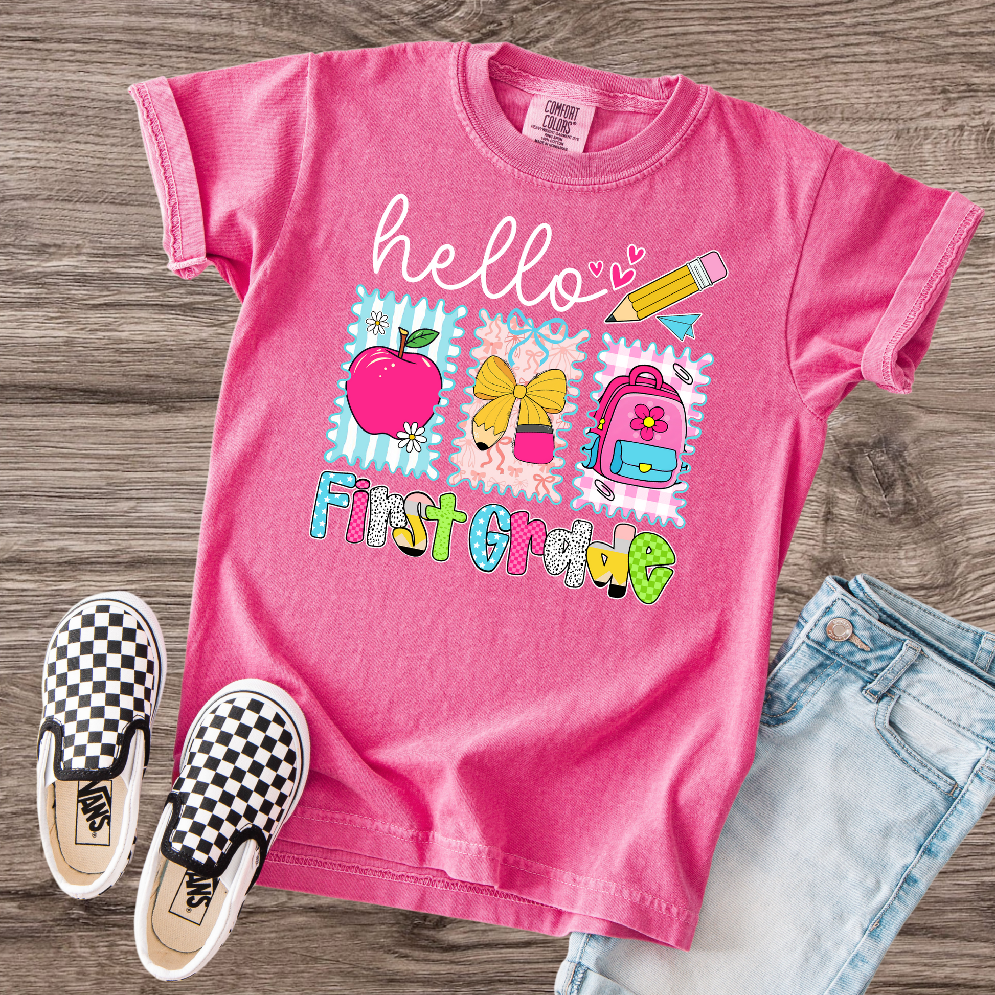 Celebrate the start of a fresh school year with our "Hello new school year" t-shirt! Made of high-quality materials, this shirt is both comfortable and stylish. Show off your excitement and school spirit with a playful and quirky design. Perfect for any student or teacher, get yours today!"