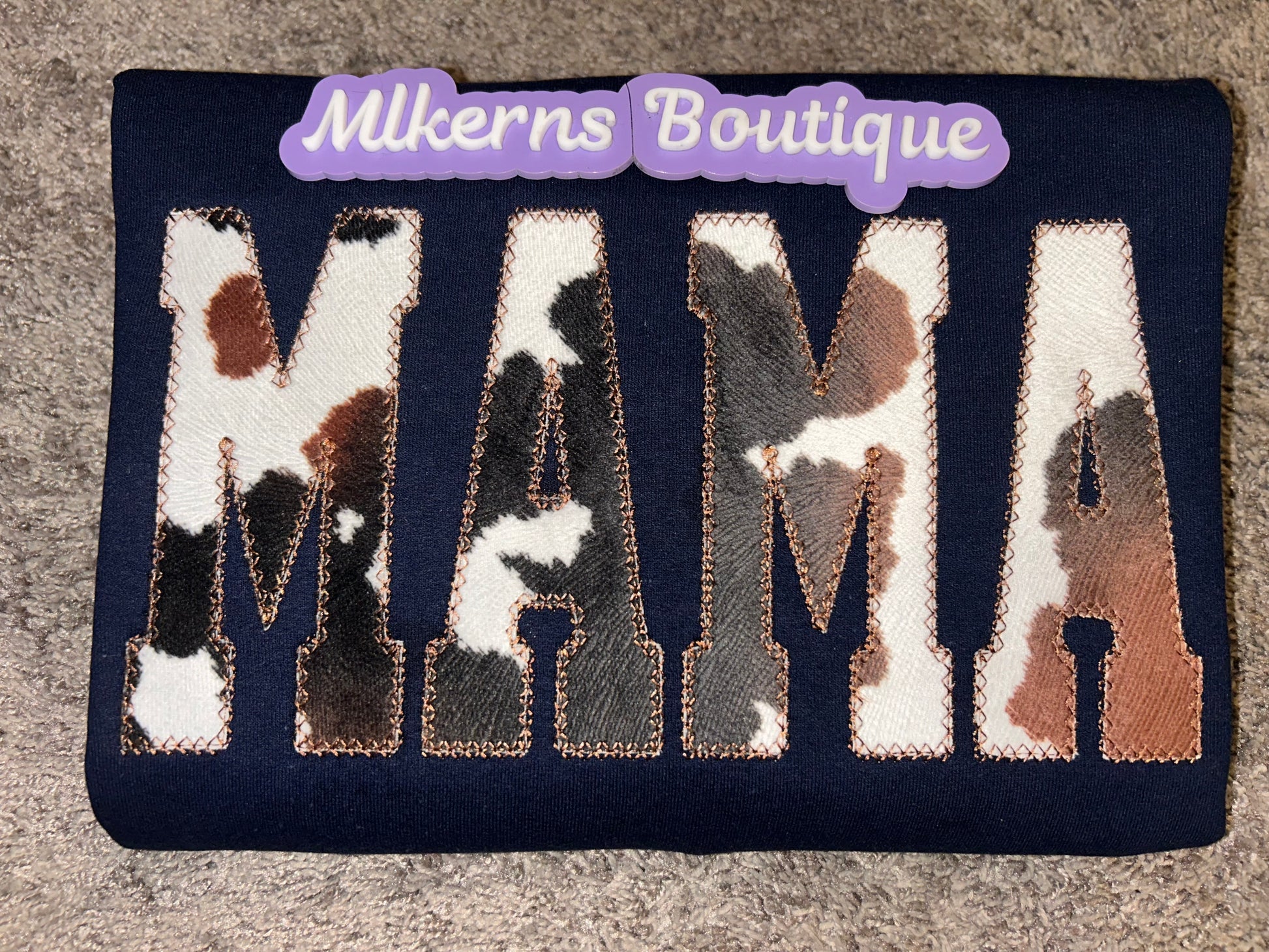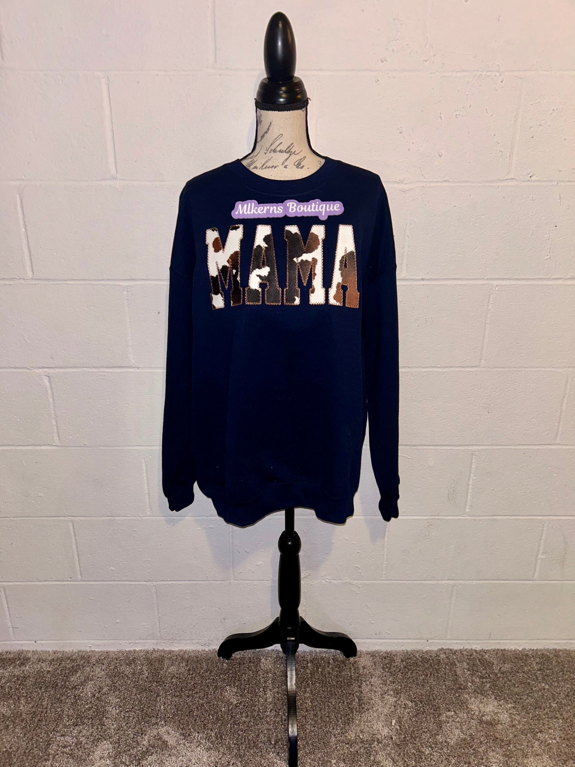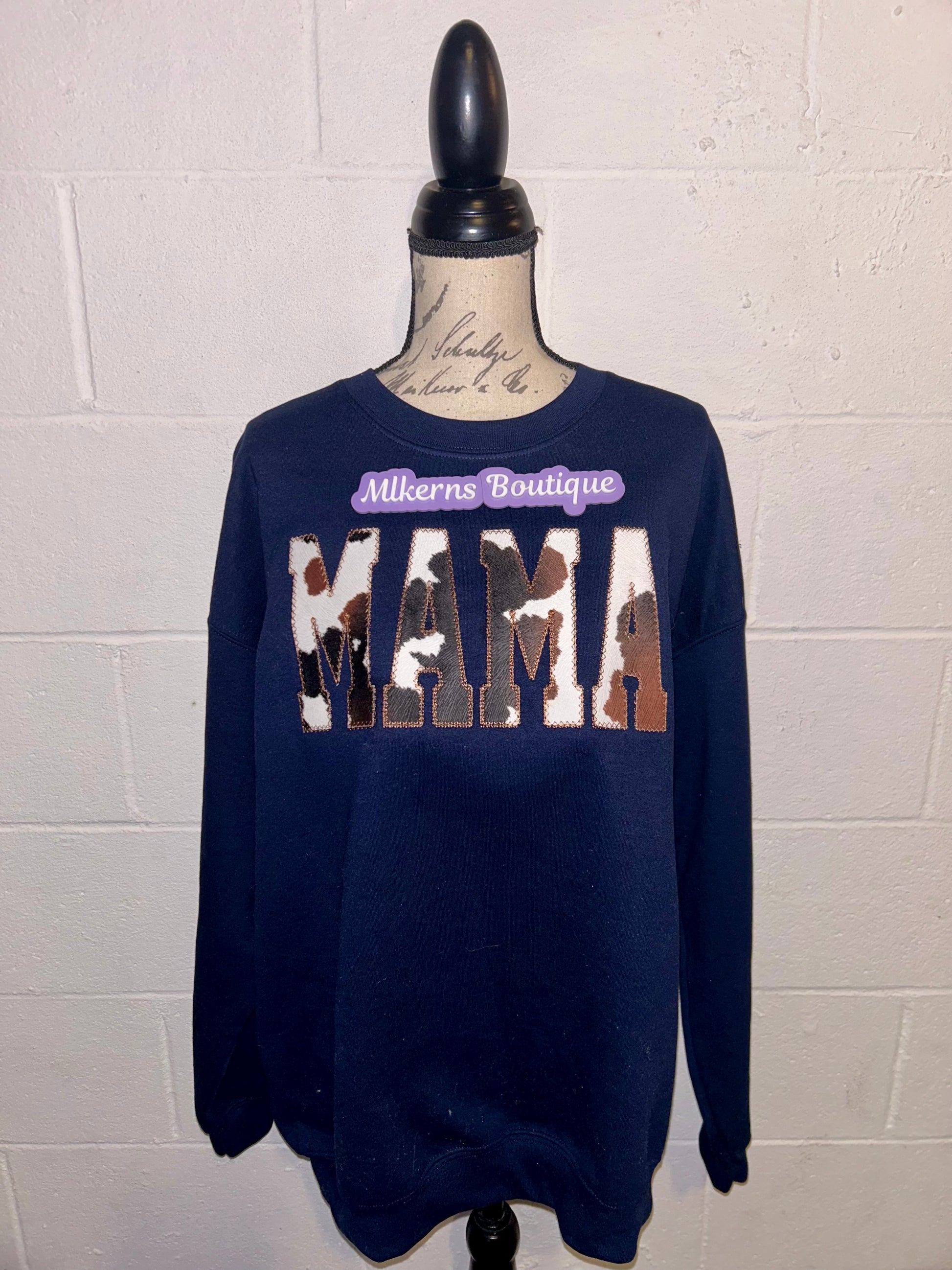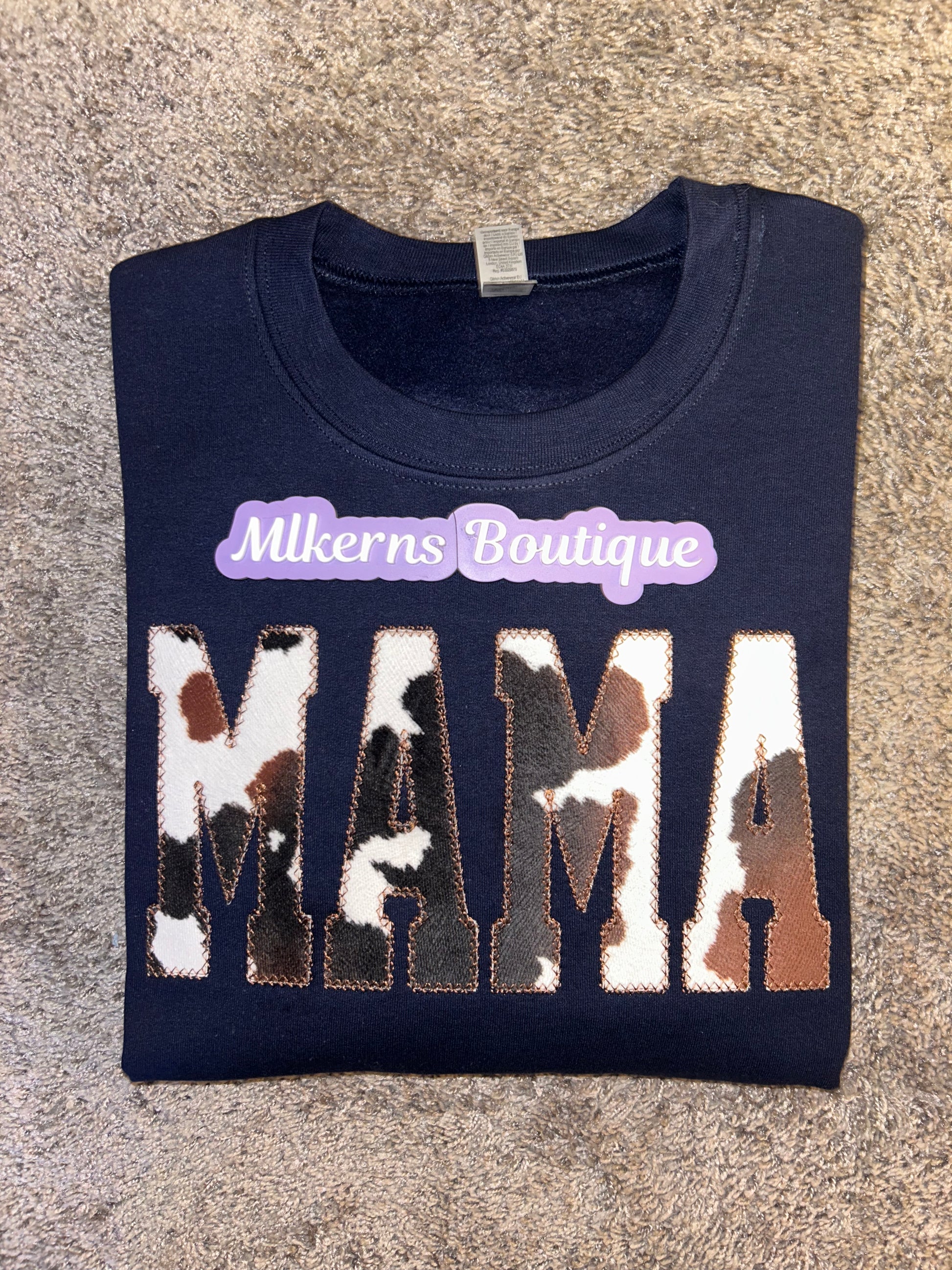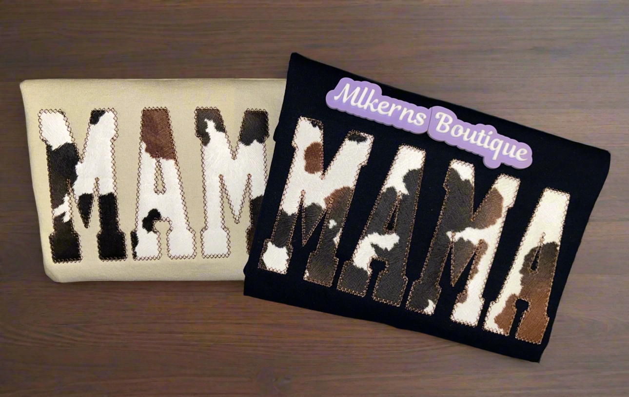 Mama cow print sweatshirt embroidered on a 50/50 Gildan sweatshirt with your choice of sweatshirt color & thread color